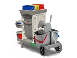 Carrello ARKA 32 in plastica lt. 25 composto da telaio con ruote diametro 80 mm, impugnatura ad "u", strizzatore regular, secchio lt. 25, manubrio con rinforzi, portasacco lt. 100 con rinforzi e coperchio, piatto reggisacco, portasecchi con supporti, supporto grande portasecchi, 2 secchi lt.4, reggicassetta o portasecchi con supporti, gancio portapaletta e gancio portamanico flip.