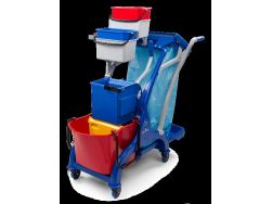 Carrello multiuso composto da base piccola con ruote DIAMETRO 100 mm. E paracolpi, un montante in rilsan, due cassette, due secchi 6 lt., un portasacco 120 lt. E un gancio portamanico flip.