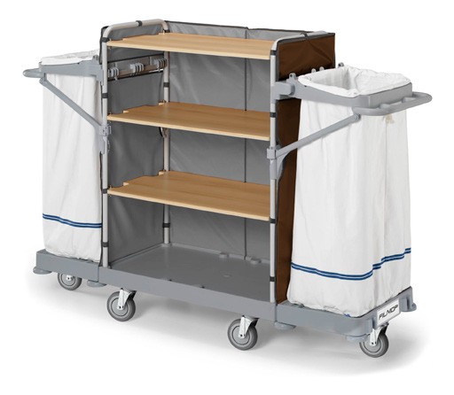 Carrello di servizio per il trasporto della biancheria pulita e la raccolta della biancheria sporca negli hotel, nelle collettività e nelle comunità. Con 2 portasacco e 3 ripiani.