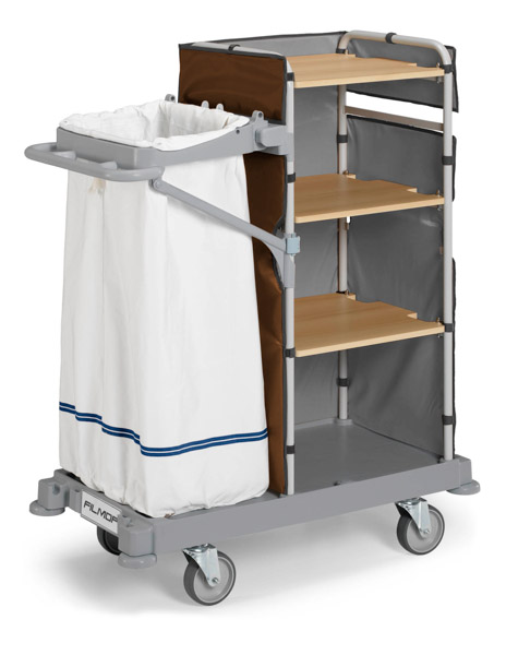 Carrello composto da base grande grigia con ruote diametro mm.125 e battistrada 35 mm, due montanti in rilsan, tre ripiani in legno 50x46 cm, due barre di rinforzo 46 cm, uno schienale interno in tela plastificata rinforzata, un portasacco in plastica 120. Per il trasporto della biancheria negli hotel, nelle collettività e nelle comunità.