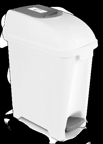 Contenitore in plastica da lt. 11 per assorbenti igienici bianco con coperchio e pedale grigio. Design innovativo e pratico. Totalmente in plastica, apertura a pedale e coperchio a "bocca di lupo" per inibire alla vista il contenuto e prevenire l'uscita di cattivi odori. Con gabbietta portadeodorante o disinfettante e tendisacco.
