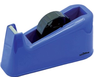 Dispenser da banco con base antiscivolo per nastri adesivi da 33/66mt in colori nero, rosso e blu.