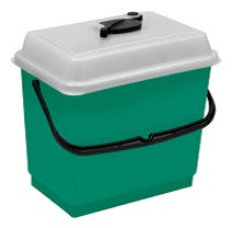 Secchio per panni in rotolo in TNT Mono-Roll. I panni vengono impregnati di soluzione detergente/disinfettante direttamente nel secchio e successivamente utilizzati singolarmente estraendoli dall'apertura centrale del coperchio.