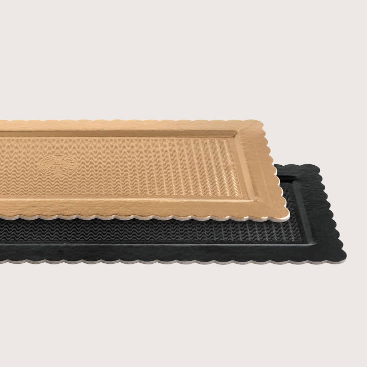 Piatto ala Black & Gold rettangolare in cartoncino accoppiato con film di poliestere, da un lato oro e da un lato nero, con bordo smerlato e fondo con decorazione antiscivolo.