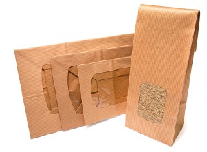 Sacchetti in carta sealing millerighe avana con finestra in polipropilene e strato di polipropilene allinterno.Ideali per il confezionamento di farina, pasta fresca, grissini, cereali, legumi,biscotti, caramelle, dolciumi e simili