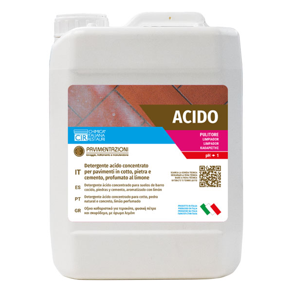 Detergente acido concentrato per l'eliminazione di residui di posa, efflorescenze saline e sporco da pavimenti in cotto, pietre naturali, cemento, manufatti, ceramiche, gres e clinker. Gradevolmente profumato al limone.
